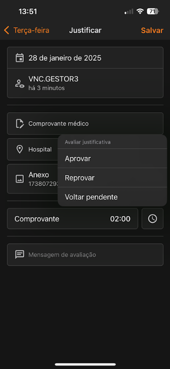 Após a análise, selecione uma das opções disponíveis para a Justificativa, sendo elas: Aprovar, Reprovar ou Voltar para Pendente. Depois de selecionar a opção desejada, clique em Salvar.