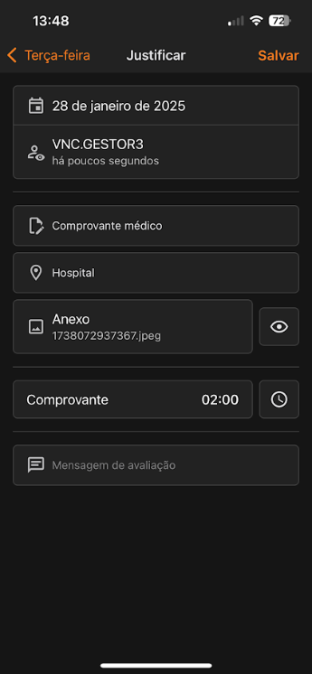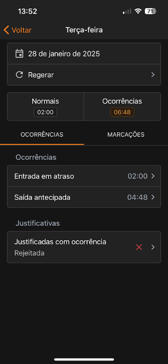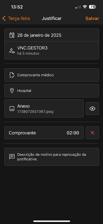 Caso a Justificativa seja reprovada, o colaborador será notificado e a ocorrência não será alterada. Para confirmar, clique em Salvar.